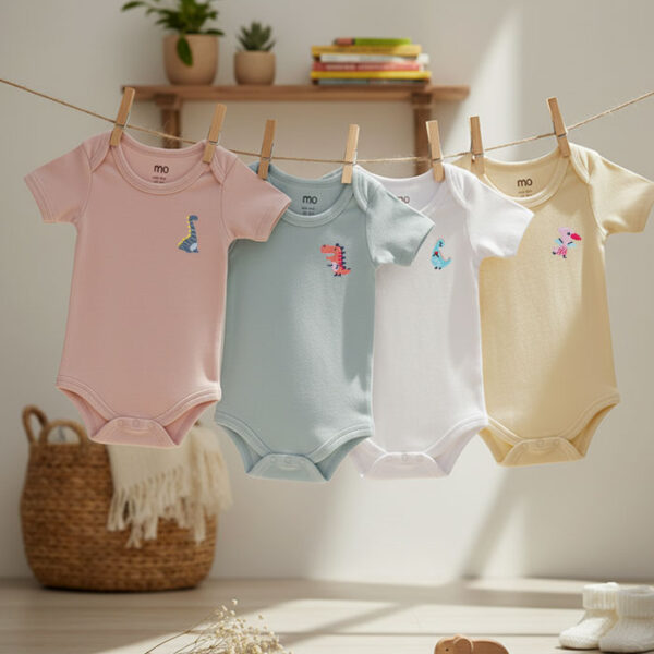 The Bodysuit Embroidered Short Sleeve Pack of 3 from MOkids combines soft cotton comfort with adorable dinosaur embroidery. Each color features a unique dinosaur stitched on the right chest, adding charm to your baby’s outfit in Egypt.